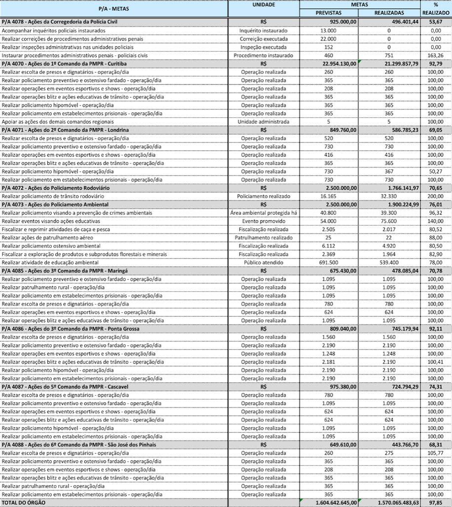 bem acima do previsto (Realizar operações policiais diversas – 2177%; Realizar cursos